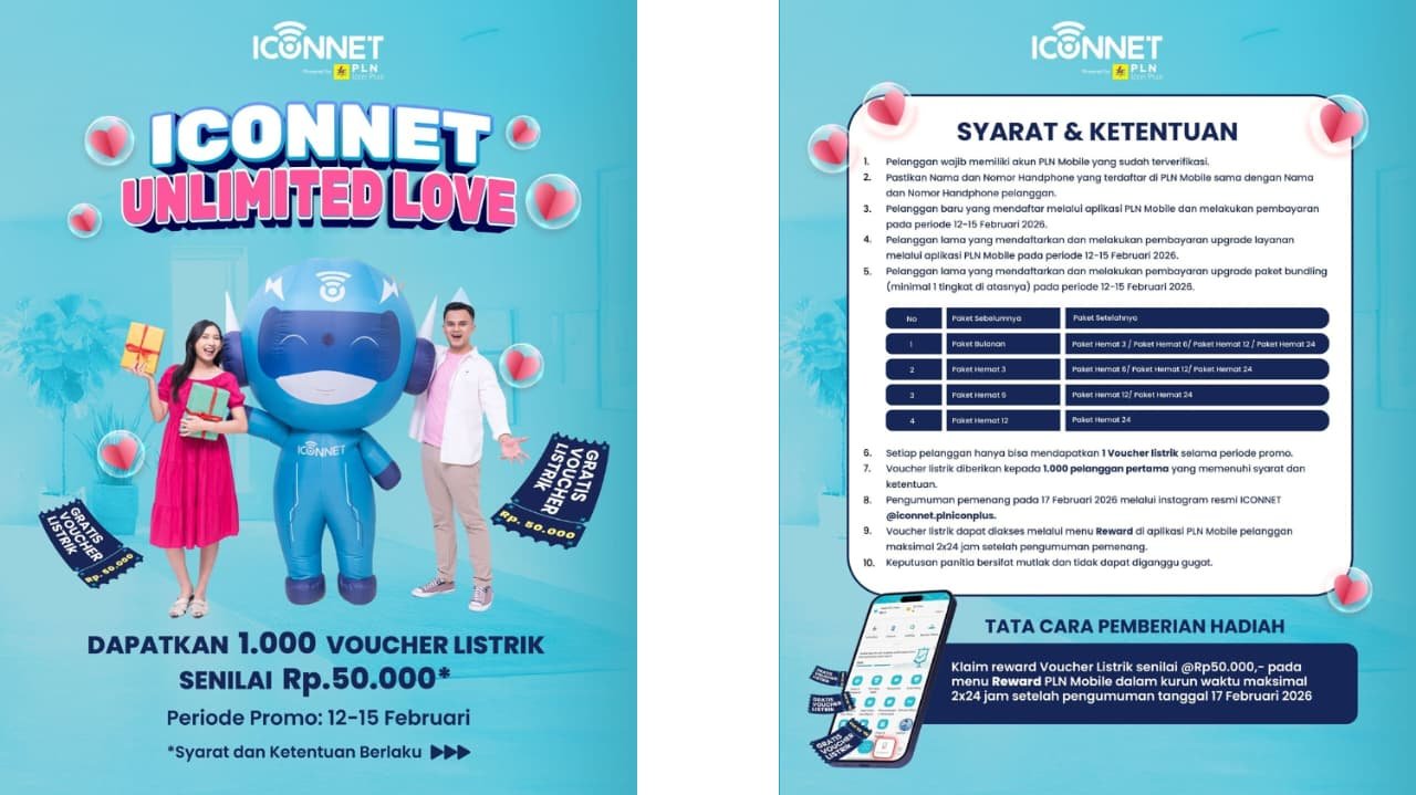 Dalam rangka menghadirkan pengalaman istimewa bagi pelanggan di momen spesial Februari, ICONNET meluncurkan program promo bertajuk “ICONNET Unlimited Love”. Melalui program ini, ICONNET memberikan 1.000 voucher listrik senilai Rp50.000 kepada pelanggan yang memenuhi syarat dan ketentuan selama periode promo 12–15 Februari 2026.